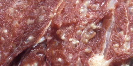 + Không mua thịt lợn nhiễm giun sán, kén sán thường nằm xen giữa các thớ thịt. Khi mua, bạn nên để ý những vùng có gân mỡ như vai, bắp, đầu, nếu thấy những hạt nhỏ trắng như hạt gạo xen giữa các thớ thịt, bắp thịt thì không nên mua.