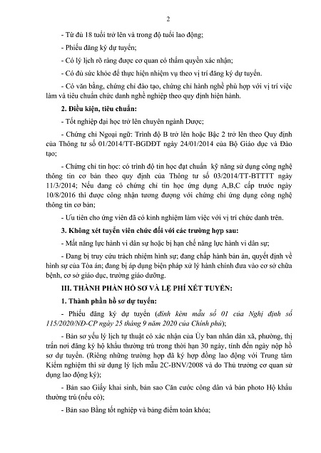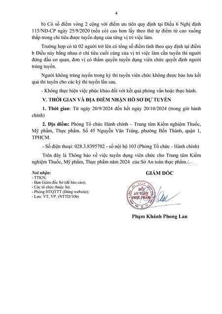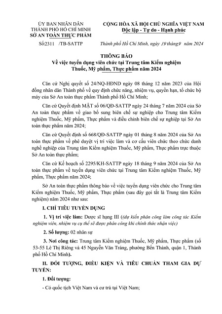 Thông báo về việc tuyển dụng viên chức tại Trung tâm Kiểm nghiệm Thuốc, Mỹ phẩm, Thực phẩm năm 2024