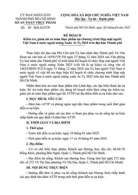 Kế hoạch Kiểm tra, giám sát an toàn thực phẩm tại chương trình Họp mặt người Việt Nam ở nước ngoài mừng Xuân Ất Tỵ 2025 trên địa bàn Thành phố