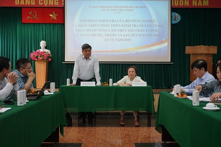 Thay mặt Ban Chỉ đạo liên ngành về an toàn thực phẩm Thành phố - Ông Lê Minh Hải – Phó Giám đốc Sở An toàn thực phẩm báo cáo kết quả triển khai Kế hoạch số 3266/KH-BCĐLNATTP ngày 20 tháng 12 năm 2024 về triển khai công tác bảo đảm an toàn thực phẩm Tết Nguyên đán Ất Tỵ và mùa Lễ hội Xuân 2025, trong đó nghiêm túc thực hiện công tác tổ chức, xác định địa bàn trọng điểm, triển khai nhiệm vụ với nhiều giải pháp, phương thức chỉ đạo, điều hành chặt chẽ, đúng quy định và phân công cụ thể cho các Sở, ban, ngành như Sở Công thương, Sở Y tế, Sở Nông nghiệp và Phát triển nông thôn… và Ban Chỉ đạo liên ngành An toàn thực phẩm các quận, huyện, Thành phố Thủ Đức nhằm tăng tính chủ động trong công tác tham mưu và tổ chức thực hiện đảm bảo an toàn thực phẩm cho người dân trên địa bàn Thành phố.