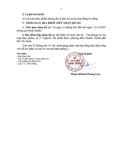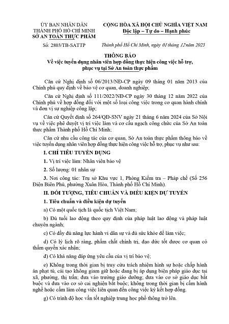 Thông báo về việc tuyển dụng nhân viên hợp đồng thực hiện công việc hỗ trợ, phục vụ tại Sở An toàn thực phẩm