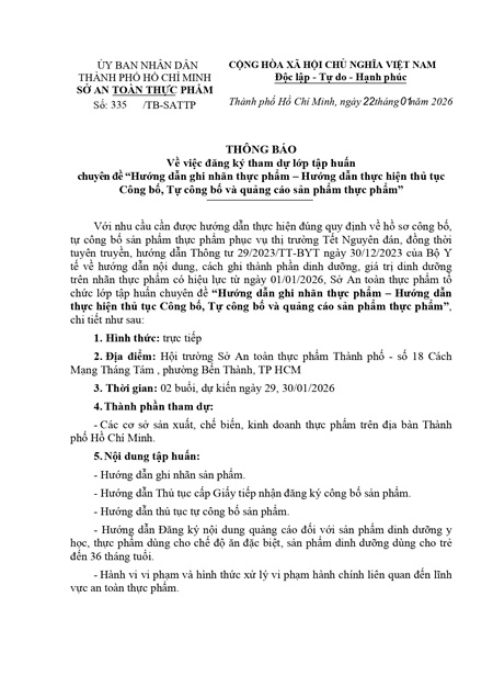 Thông báo về việc đăng ký tham dự lớp tập huấn chuyên đề “Hướng dẫn ghi nhãn thực phẩm – Hướng dẫn thực hiện thủ tục Công bố, Tự công bố và quảng cáo sản phẩm thực phẩm”