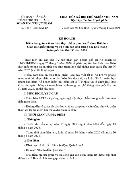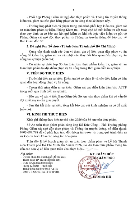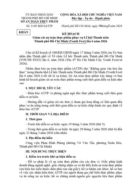 Kế hoạch Giám sát an toàn thực phẩm phục vụ Lễ hội Thanh niên Thành phố Hồ Chí Minh (Youth Fest) lần 6 năm 2026