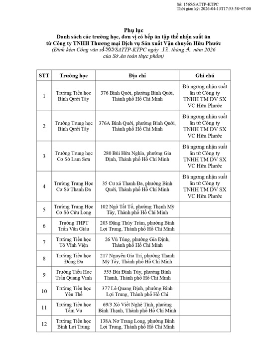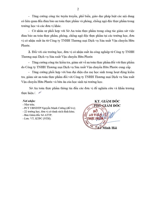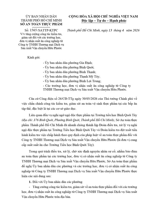 Tăng cường công tác kiểm tra, giám sát đối với các trường học, đơn vị nhận suất ăn công nghiệp từ Công ty TNHH Thương mại Dịch vụ Sản xuất Vận chuyển Hữu Phước