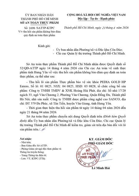 Thu hồi sản phẩm không bảo đảm quy định an toàn thực phẩm